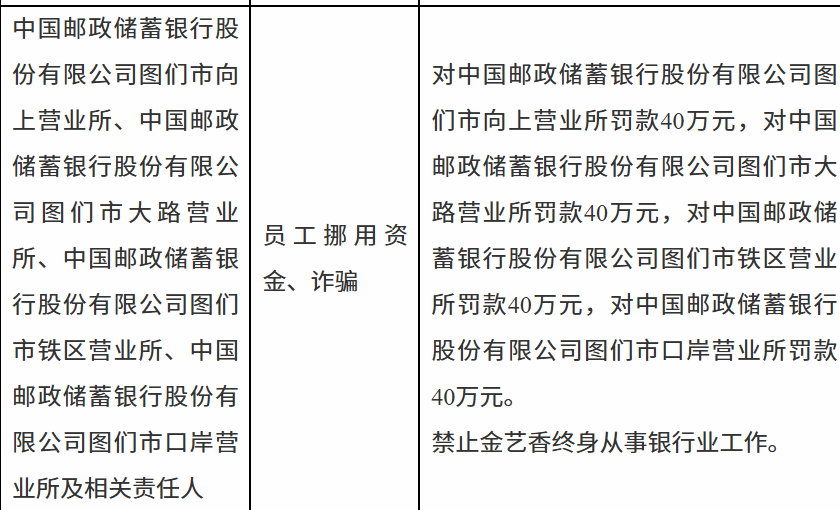 1月29日,延边金融监管局行政处罚信息公示列表显示,中国邮政储蓄银行股份有限公司图们市向上营业所、中国邮政储蓄银行股份有限公司图们市大路营业所、中国邮政储蓄银行股份有限公司图们市铁区营业所、中国邮政储蓄银行股份有限公司图们市口岸营业所因员工挪用资金、诈骗分别被罚款40万元。责任人金某香被终身禁业。
